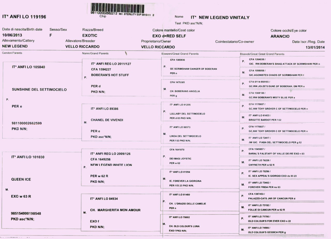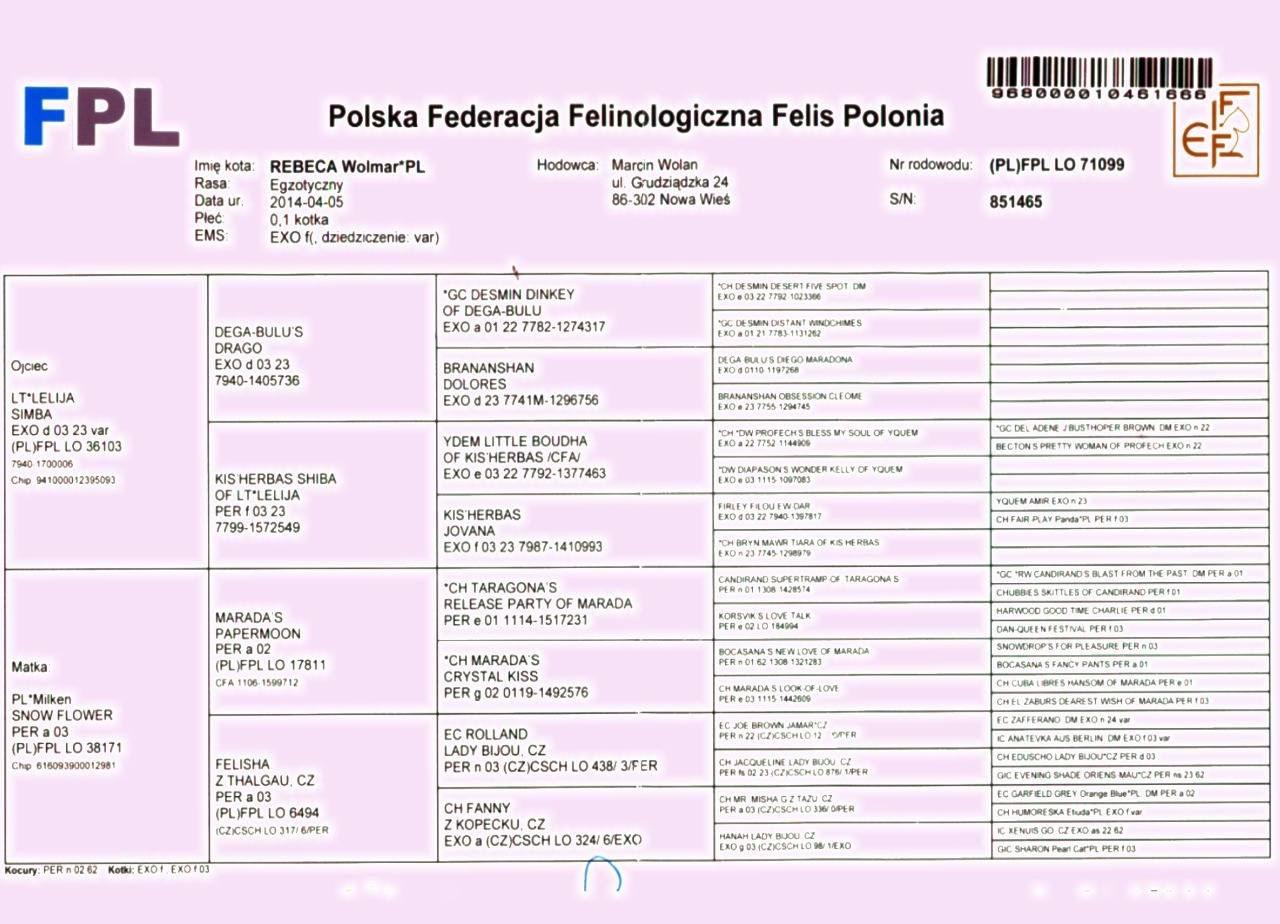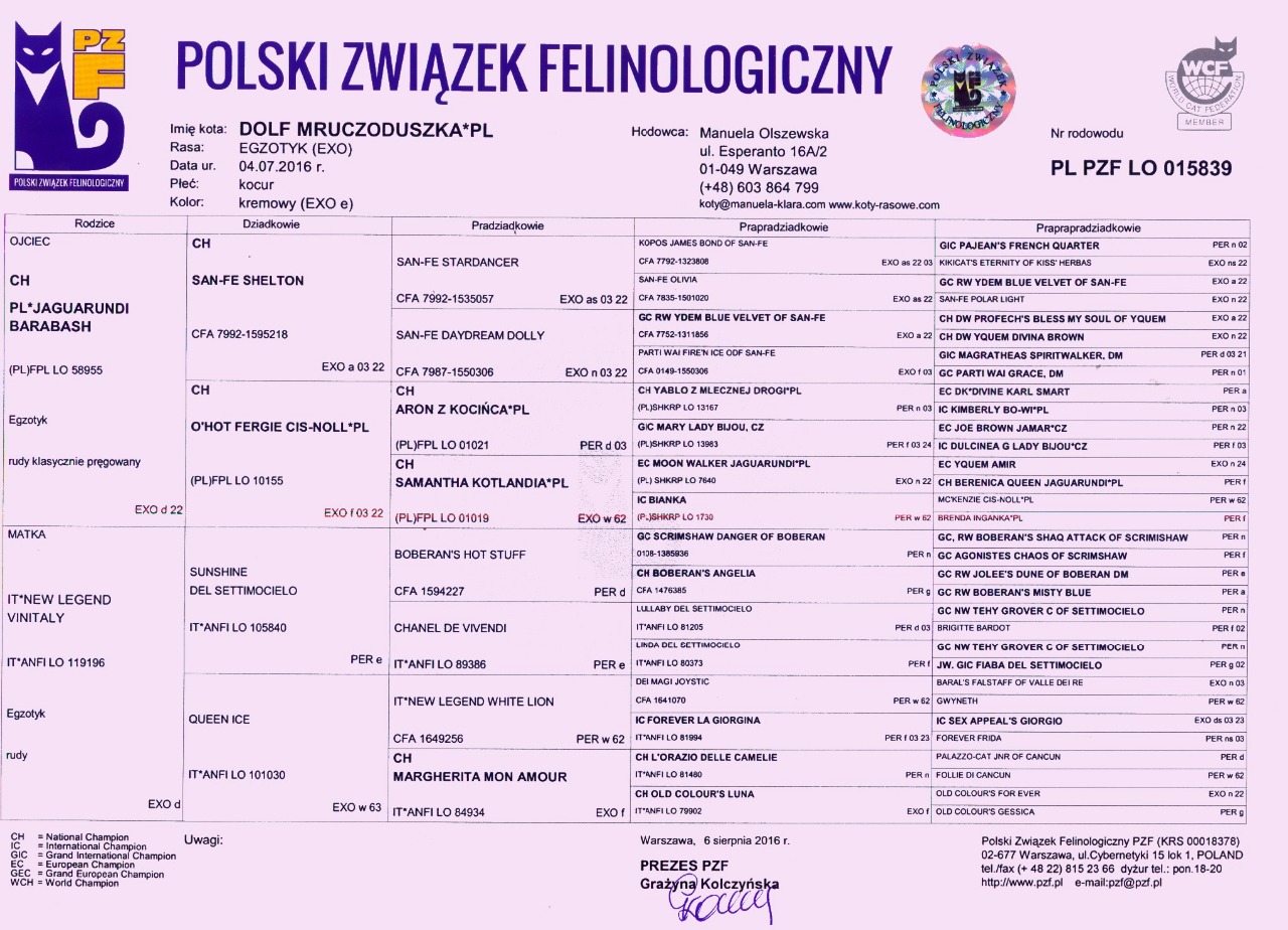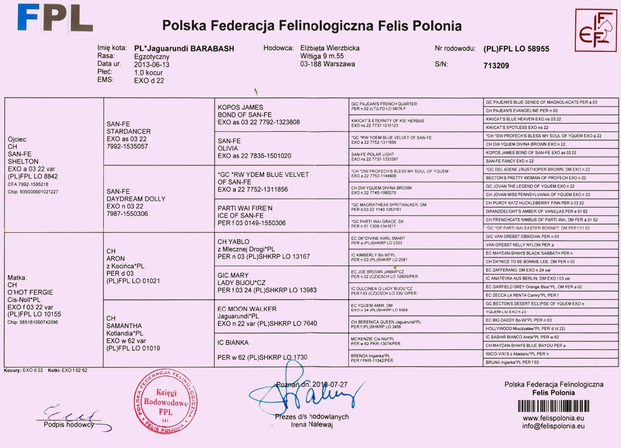 Linie hodowlane/breeding lines : BOBERAN, PARTI WAI, SAN-FE, NEW LEGEND, SETTIMOCIELO, LADY BIJOU, LELIJA, KIS ' HERBAS, CAT'S SERVICE, JAGUARUNDI, BO-WI, SCIROCCO, BRANANSHAN, DEGA-BULU, MARADA, MILKEN